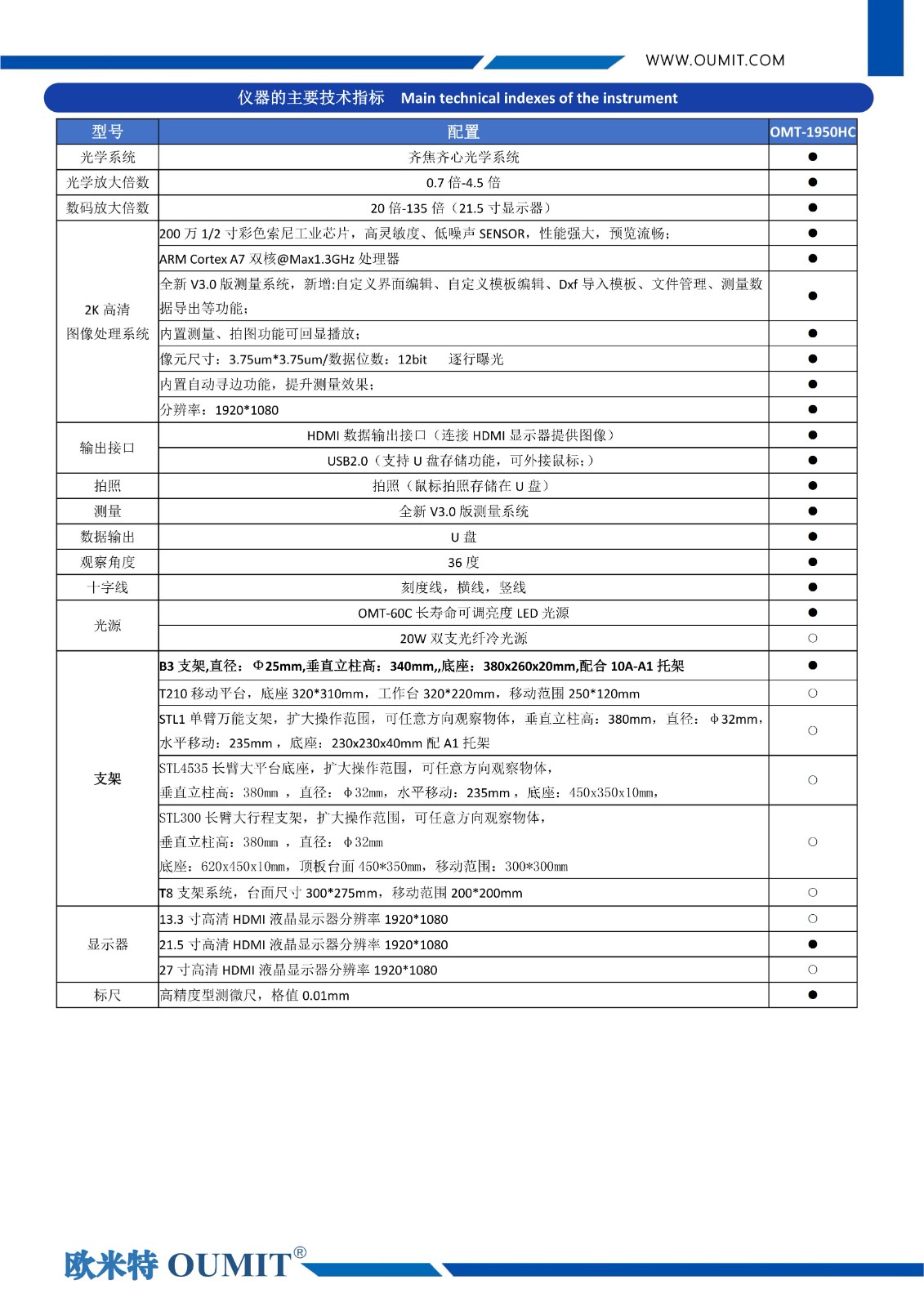 高清黄瓜视频成人 OMT-1950HC系列标准配置参数